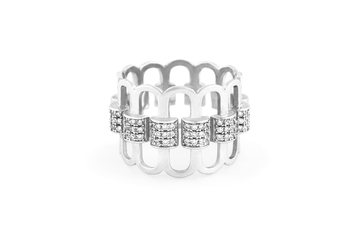 Prsten izrađen od srebra interesantnog dizajna, ukrašen blistavim cirkonima.